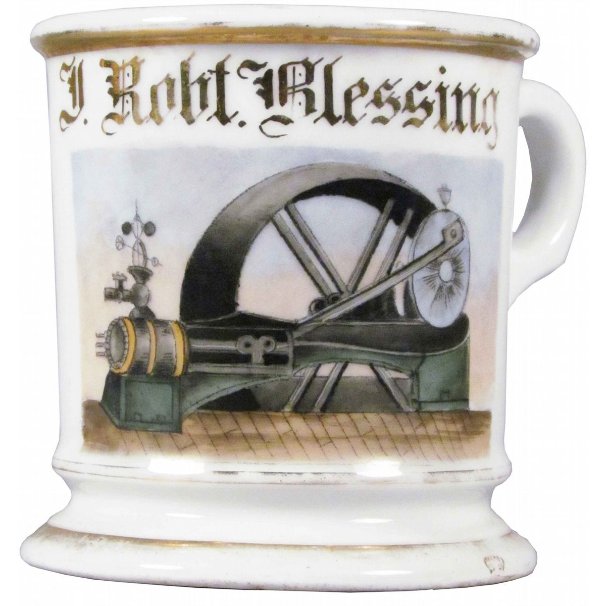 Occupational Shaving Mug, Steam Engine Motif for J. Robt. Blessing. No chips or cracks.