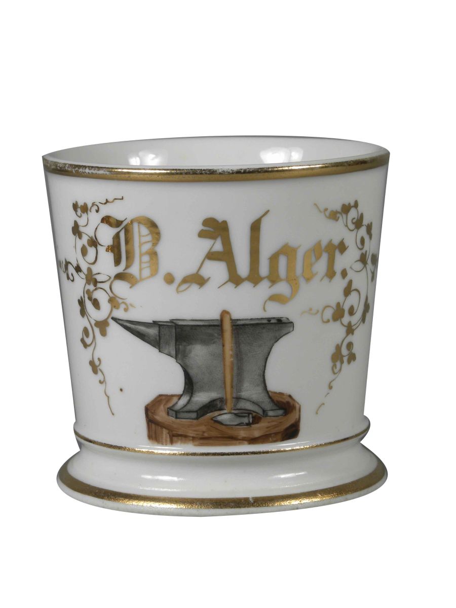 Occupational Shaving Mug depicting an anvil and hammer for B. Alger. No chips or cracks, near mint condition.