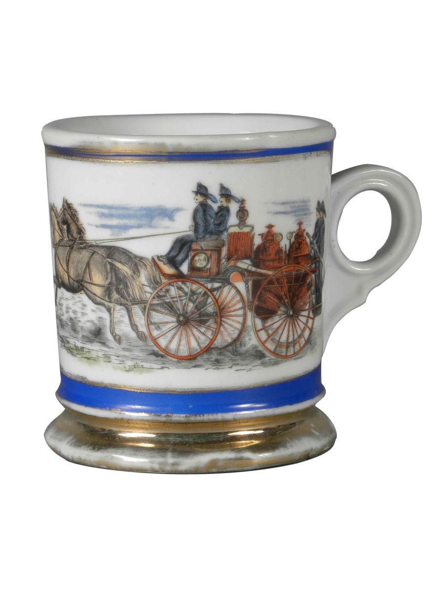 Fireman's Occupational Shaving Mug depicting Horse drawn steam pumper and four fireman. Marked on bottom 1210. No chips or cracks, excellent condition.