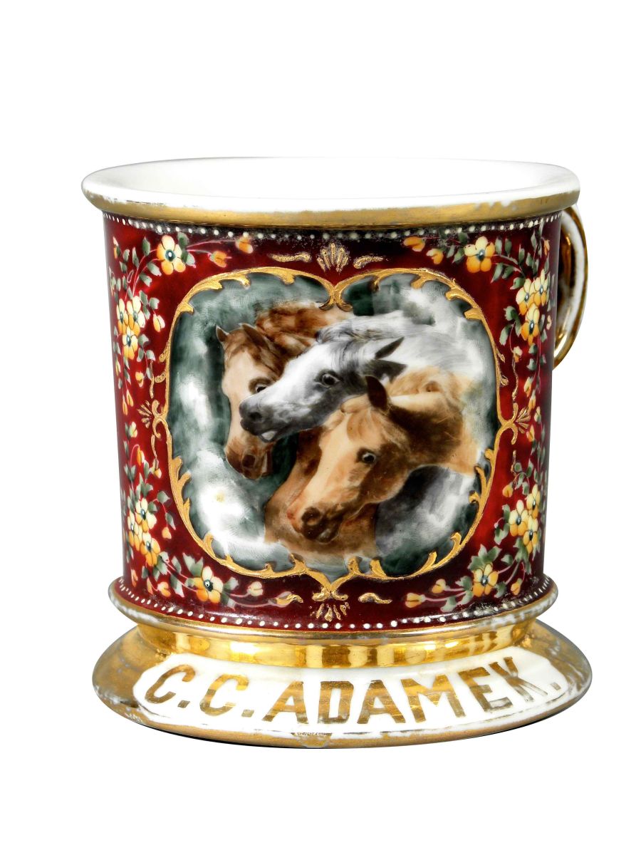 Occupational Shaving Mug depicting three horses for C.C. Adamek. Marked on bottom J.M. Garrett, Kansas City, MO. No chips or cracks. Some wear to gold on high spots otherwise excellent condition.