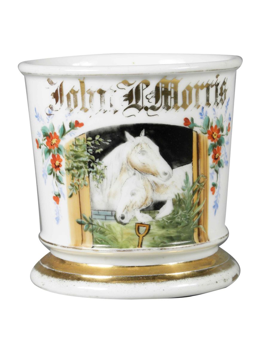 Occupational Shaving Mug depicting two white horses for John Morris. Marked T.V. France, Fred Dolla Barber Supplies, Chicago on bottom. No chips or cracks, some slight wear to gold trim otherwise excellent condition.