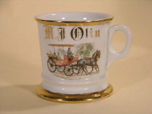 Occupational shaving mug - name appears to be M.J. Olin. Scene of horse-drawn surrey-type wagon with people riding inside. No chips or cracks.