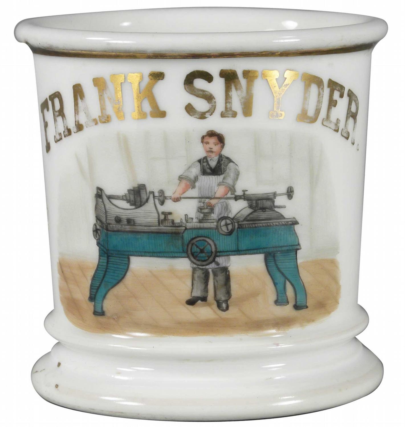Occupational Shaving Mug for Frank Snyder depicting man working on lathe. No chips or cracks. Very good condition.