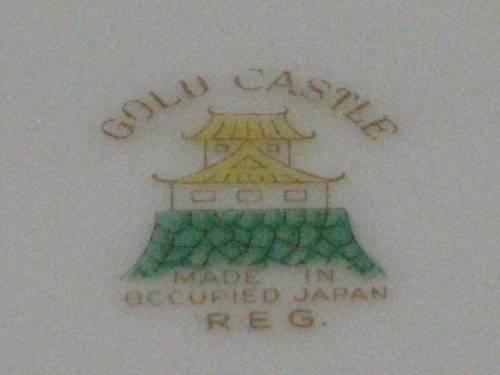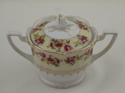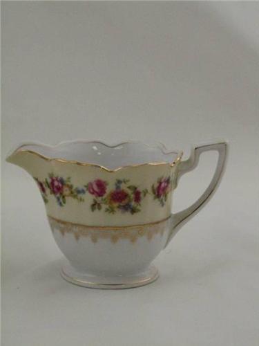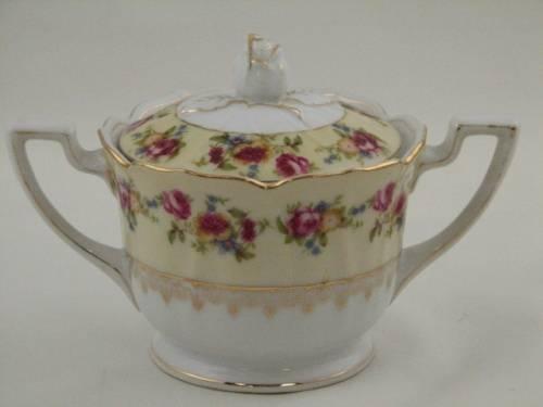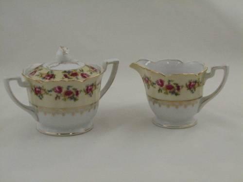 Occupied Japan Gold Castle Sugar and Creamer with roses and gold accents. Circa 1945-1952. Excellent condition. Dimensions: Sugar 4.5"H x 4.5"D, Creamer 3"H x 3.25"D.