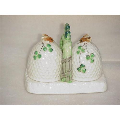A set of salt and pepper shakers made in occupied Japan in the shape of two bee hives, each topped with a tiny bee. The two shakers sit in a holder with an asparagus handle. 3 1/4" tall, 3 3/4" long. Marked as shown.