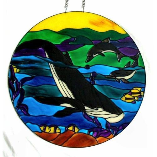 Totally awesome array of sparkling color immediately becoming the focal point by day or evening. The painting has a diameter (not circumference) of 20" so it is very large. A perfect window panel in every respect.