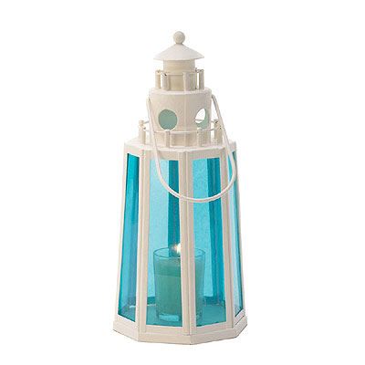 Ocean Blue Lighthouse Lantern **|**|** Indoors or out, the ocean-blue glass and white metal of this lighthouse lantern is a cheerful coastal accent for your home. Open the door to place a candle inside to soak in the cheery radiance. Item weight: 0.7 lb. 5 x 5" x 10" high; 13-1/4" high with handle. Iron and glass. 1 EA"