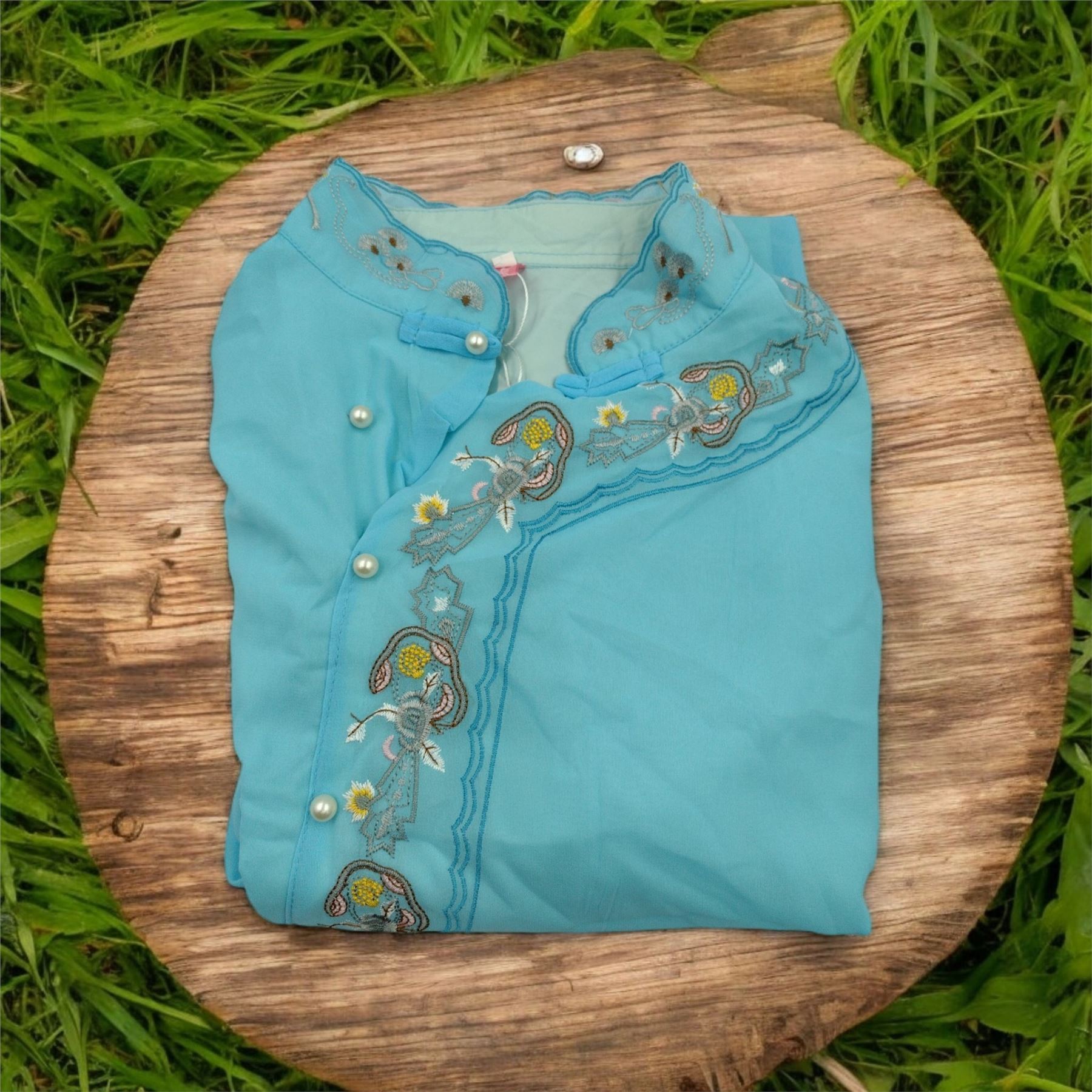 Ocean Blue Midi Dress with flower Embroidery with Pearly butttons size L