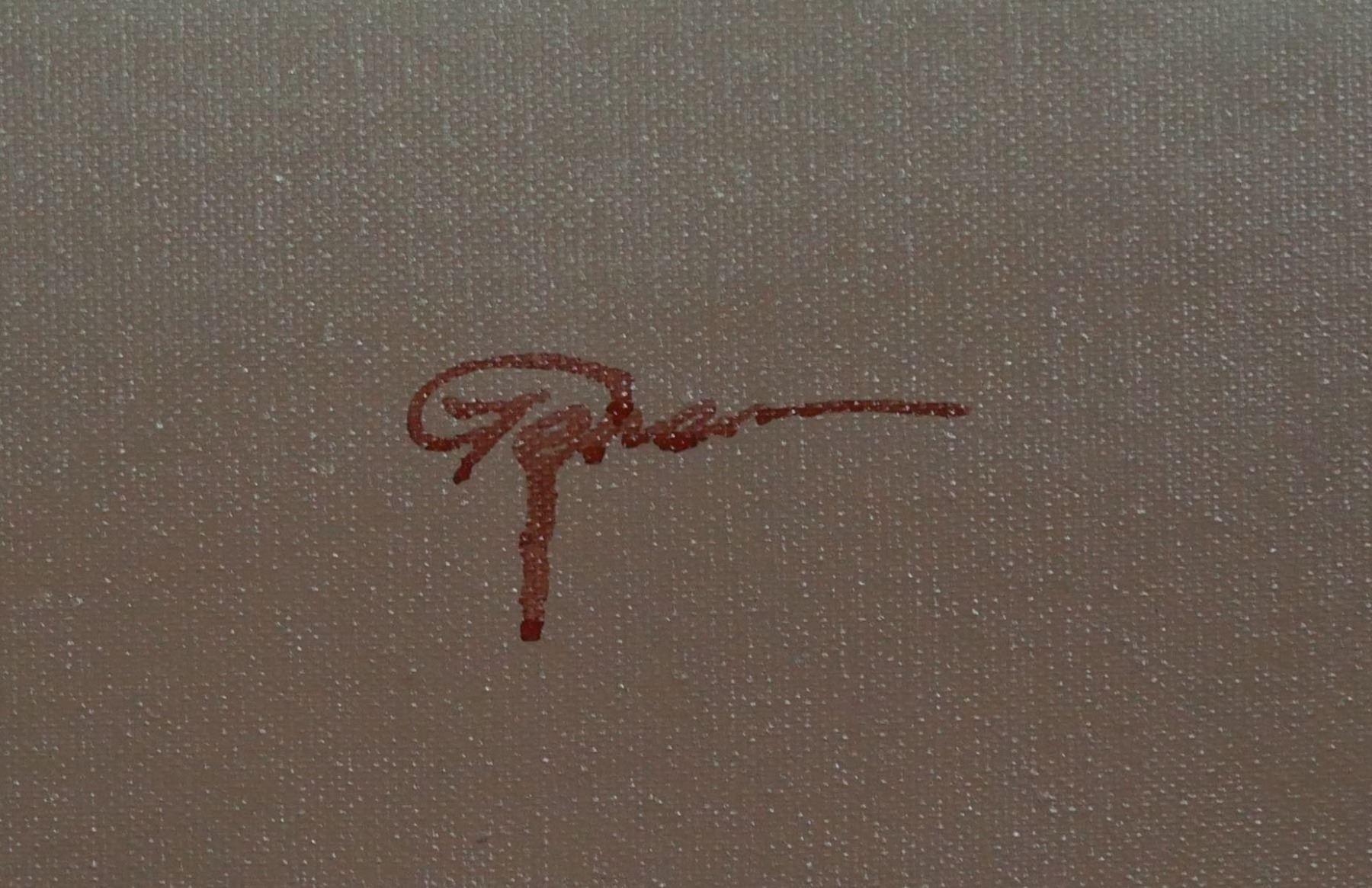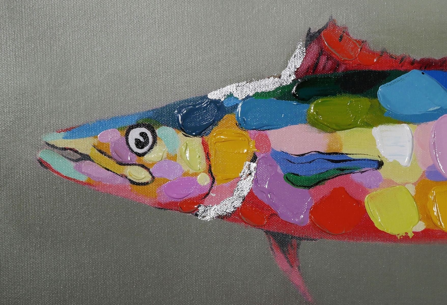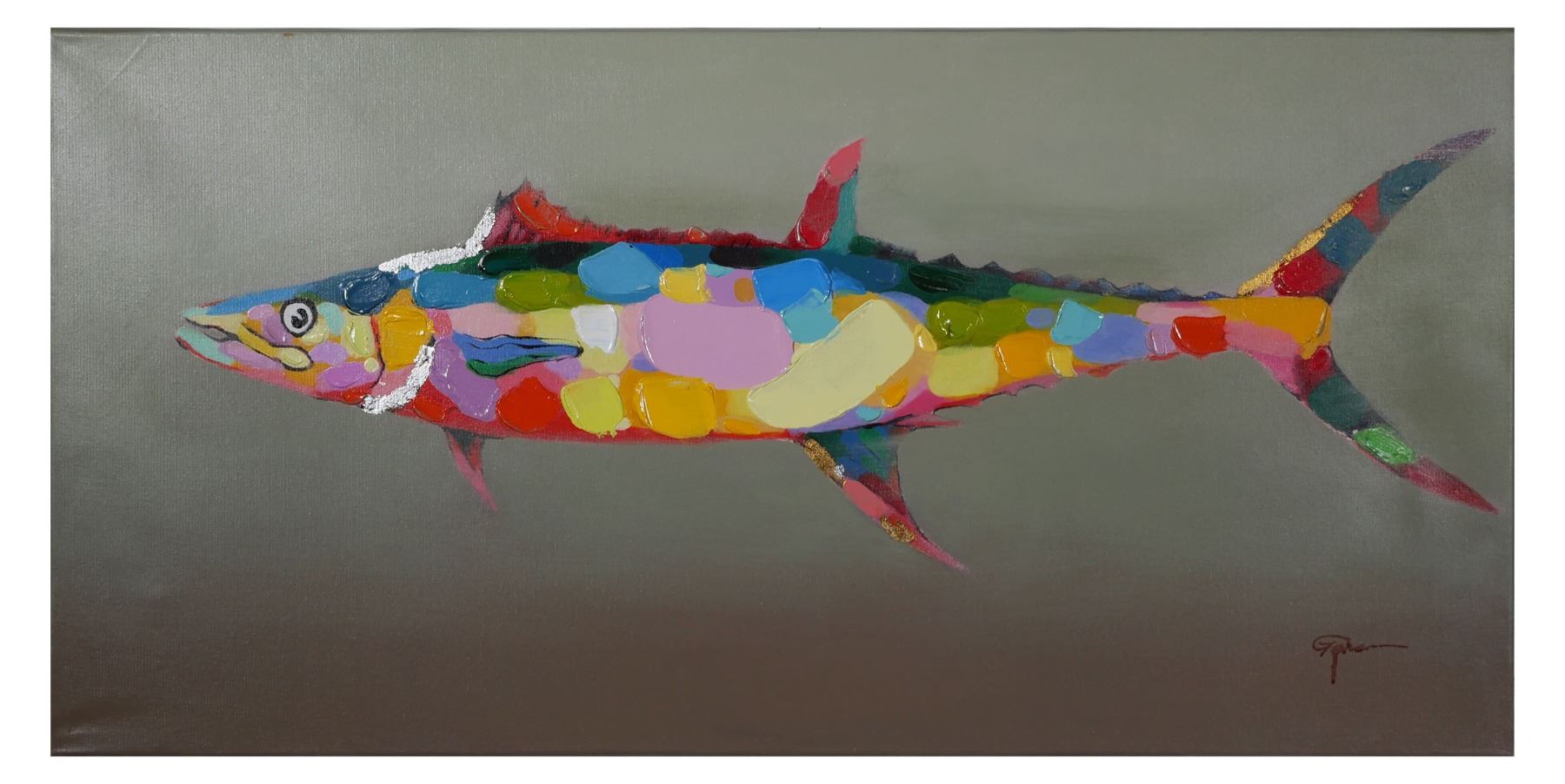 Oil on canvas painting of large ocean fishin bright bold colors. Illegibly signed at lower right. Possibly "Gerson." Canvas size is 48" x 24", unframed. Excellent condition.