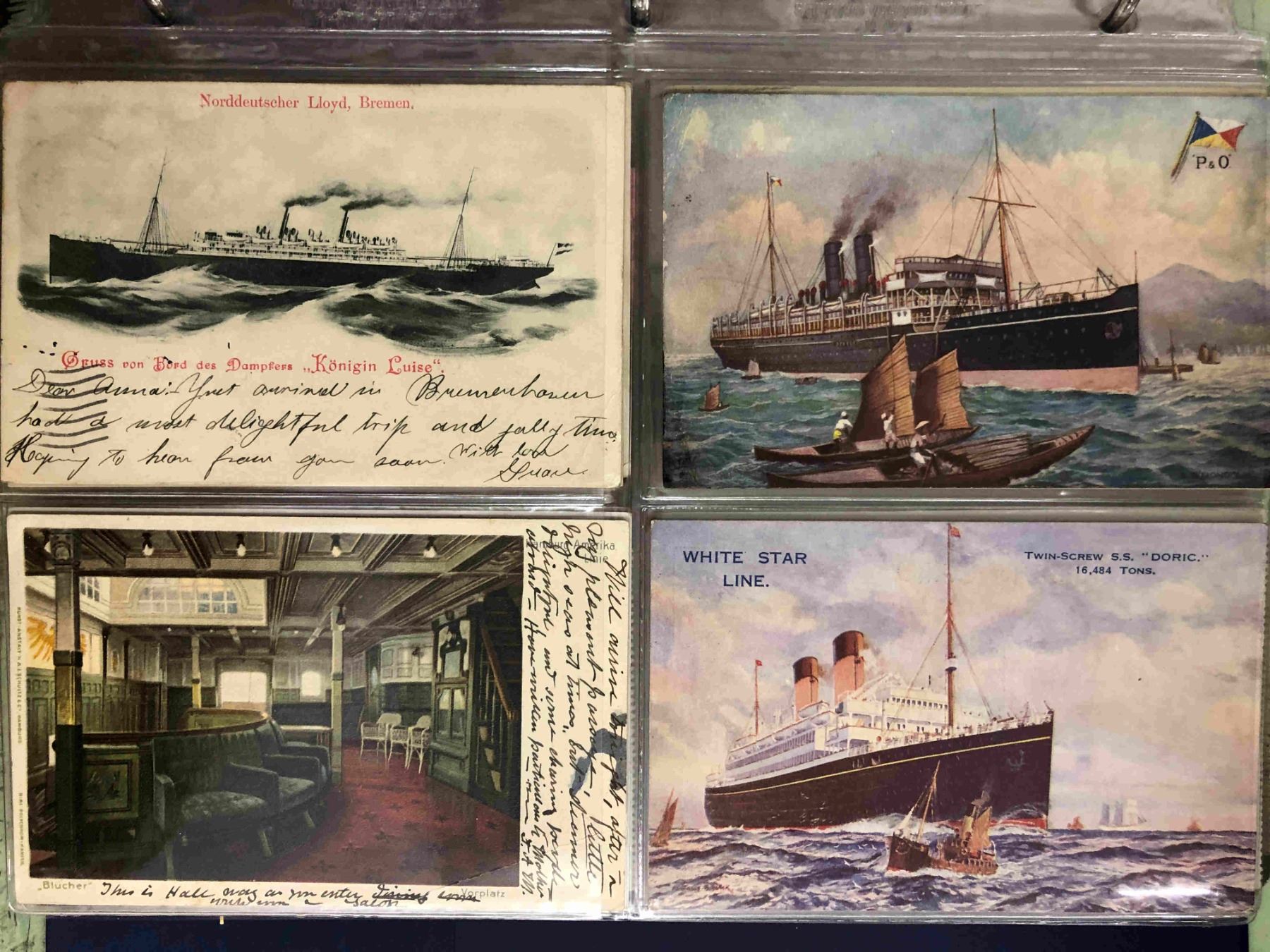 Album of all early ocean liners. Interiors, Exteriors, real photo, etc. Lusitania, Red Star, White Star, Hamburg American Line, Norddeutcher Lloyd Bremen & more.