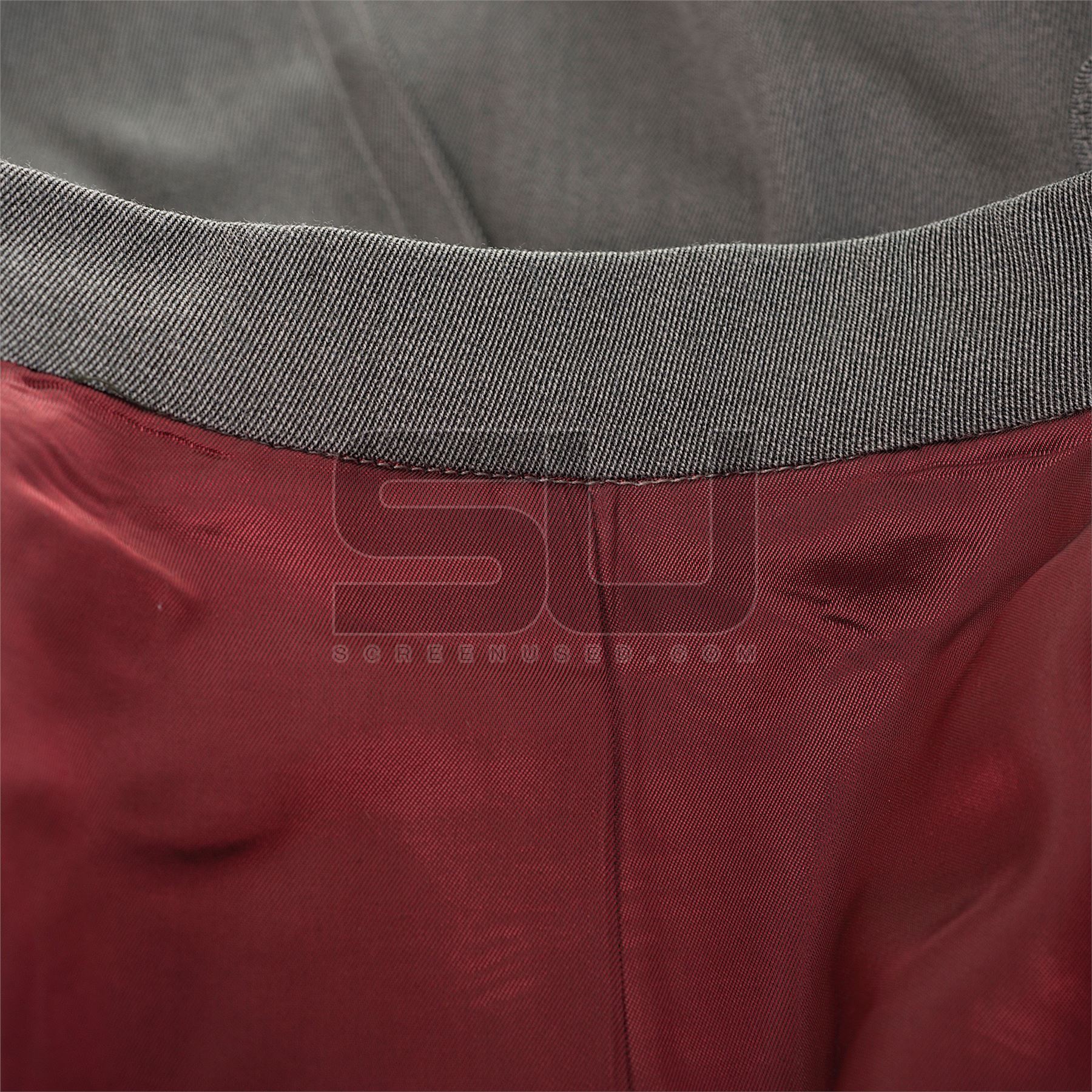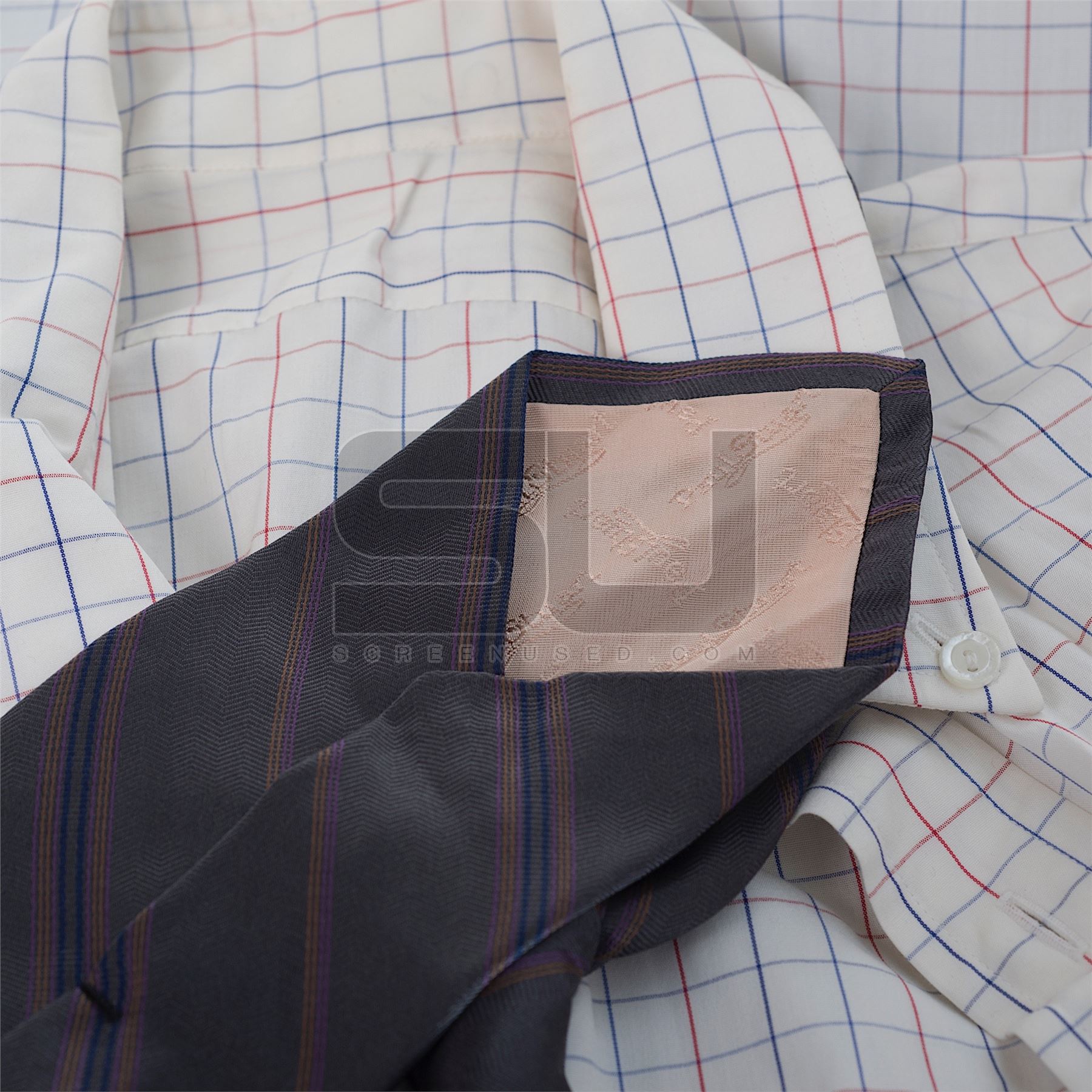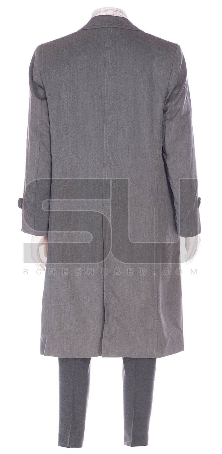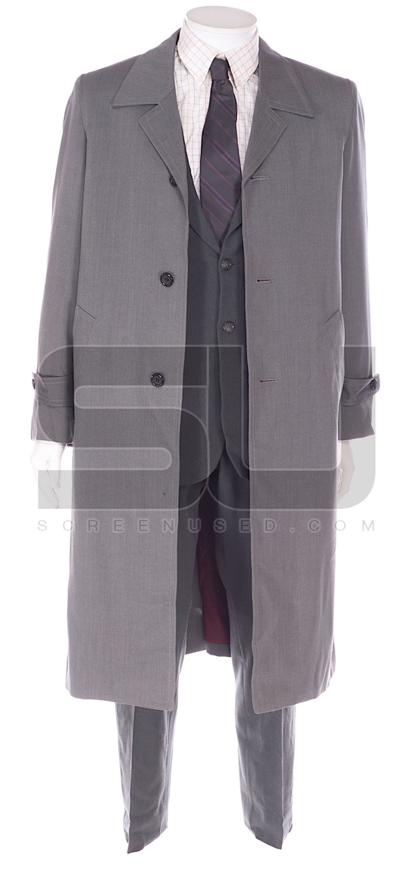 This outfit was acquired by the production for use by Matt Damon as "Linus Caldwell". The outfit consist of a two piece grey suit, white shirt with plaid pattern, a grey silk tie, and a grey trench coat.