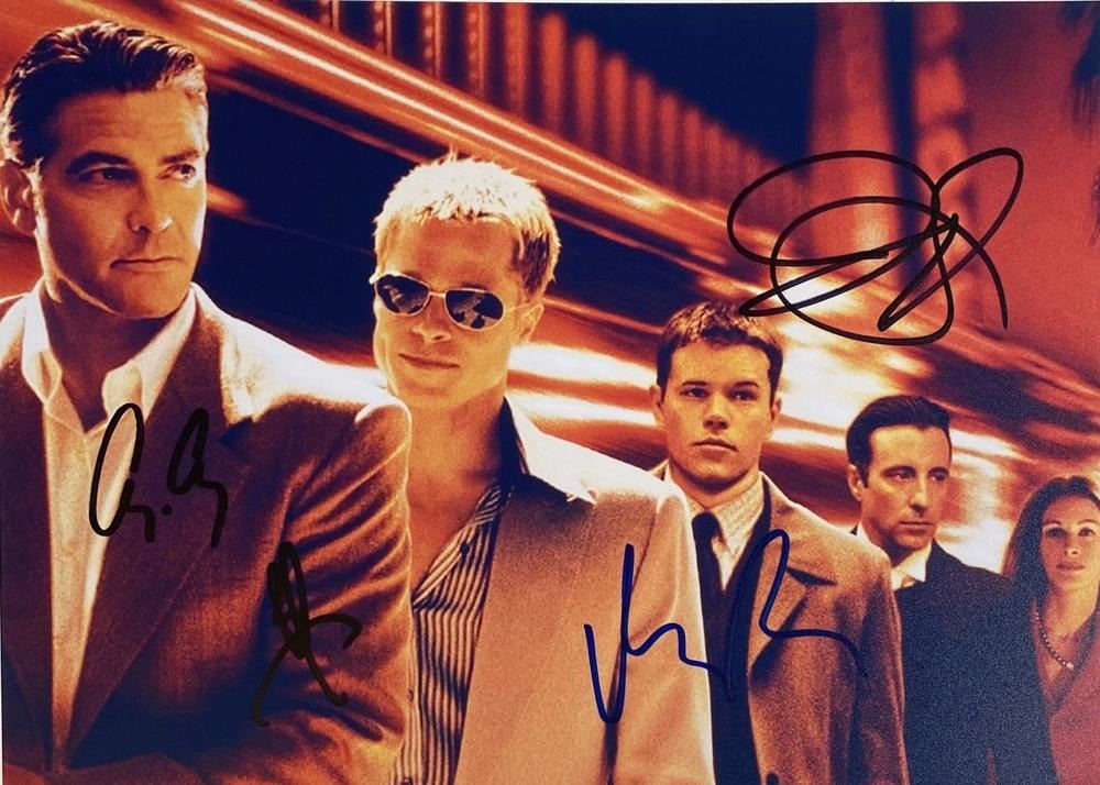 Ocean's Eleven cast facsimile signed movie photo autographed by George Clooney, Brad Pitt, Matt Damon and Julia Roberts. 8x10 inches. This item is a reprint of an original autograph
