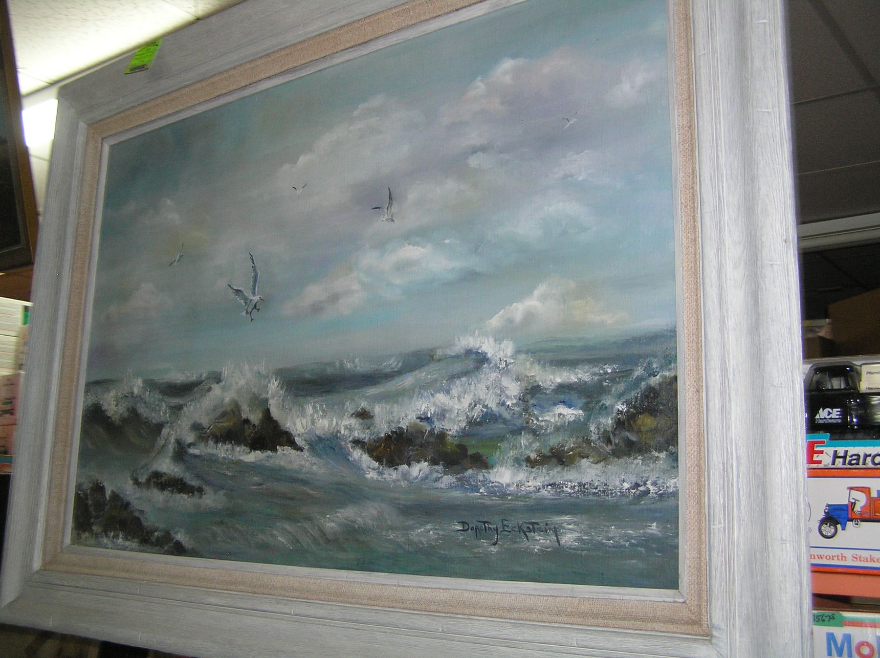 Ocean scene with crashing waves and seagulls artist signed Dorothy est. value $600.00-$800.00