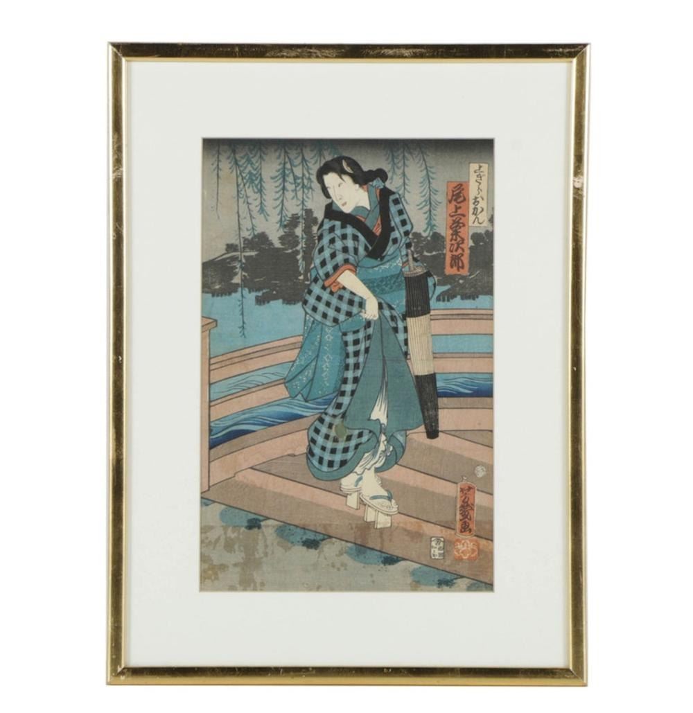 Ochiai Yoshiiku- "A Figure On a Bridge" JAPANESE WOODBLOCK BRIDGE. A Japanese woodblock on paper of a figure after Ochiai Yoshiiku (__ __, 1833-1904), also known as Utagawa Yoshiiku (__ __). The work depicts a woman in a blue garment on a bridge using bright patterns and crisp lines. Presented matted and framed under glass. FINE CONDITION