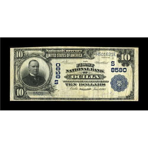 <B>Ocilla, GA</B></I> - $10 1902 Plain Back Fr. 626 <B>The First NB</B></I> Ch. #(S)8580<BR>We sold a damaged Fine of this type and denomination from this scarce issuer at our 2004 Florida United Numismatists auction for $632.50. This addition to the census is head and shoulders above that example and is only the fifth large note to surface from here. It is well centered, bright and well within the confines of the <B>Very Fine</B></I> grade and offers the additional enhancement of being the highest grade of any of the small population of large notes traced from here.<BR><BR><b>Shipping:</b> Coin/Currency (<a target="_blank" href="http://www.heritageauctions.com/common/shipping.php">view shipping information</a>)