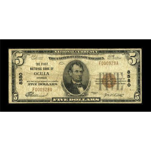 <B>Ocilla, GA</B></I> - $5 1929 Ty. 1 <B>The First NB</B></I> Ch. # 8580<BR> Problem free, evenly circulated paper is noted on this issue. <B>Very Good-Fine.</B></I><BR><I>From The Amelia Island Collection.</B></I><BR><BR><b>Shipping:</b> Coins & Currency (<a target="_blank" href="http://www.heritageauctions.com/common/shipping.php">view shipping information</a>)