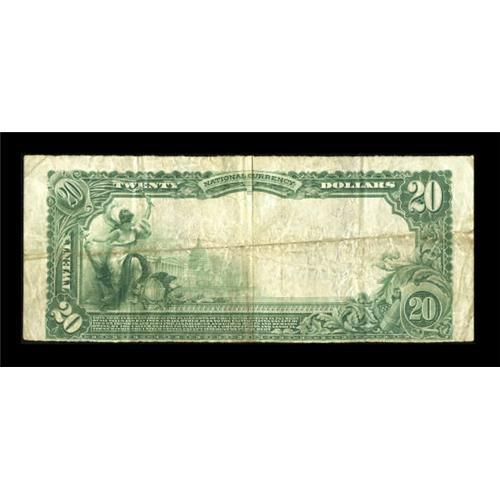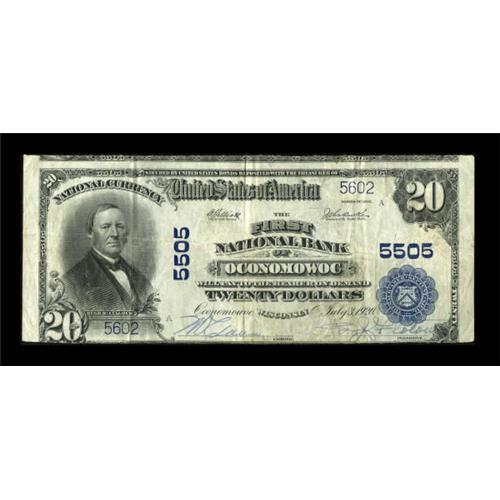 <B>Oconomowoc, WI</B></I> - $20 1902 Plain Back Fr. 659 <B>The First NB</B></I> Ch. # 5505<BR> While the number of notes known from this bank is not miniscule, all but a couple of small notes have been tightly held for years. Track and Price shows no offerings of any large note from this bank for the past twenty years. <B>Fine-Very Fine,</B></I> but cut into the design at the bottom, with a strip of the note above visible at the top. <BR><BR><b>Shipping:</b> Coins & Currency (<a target="_blank" href="http://www.heritageauctions.com/common/shipping.php">view shipping information</a>)