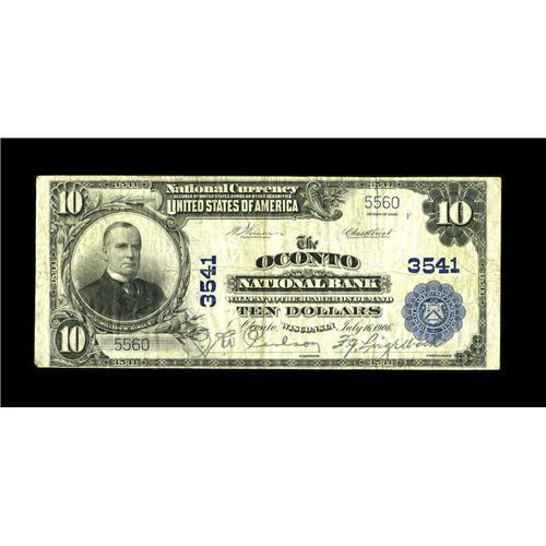 <B>Oconto, WI</B></I> - $10 1902 Plain Back Fr. 626 <B>The Oconto NB</B></I> Ch. # 3541<BR>This is the tougher of the two banks in town and that includes both large and small size. This $10 sports dark printed signatures of C.W. Carlson and F.J. Lingelbach. <B>Fine+.</B></I><BR><BR><b>Shipping:</b> Coin/Currency (<a target="_blank" href="http://www.heritageauctions.com/common/shipping.php">view shipping information</a>)