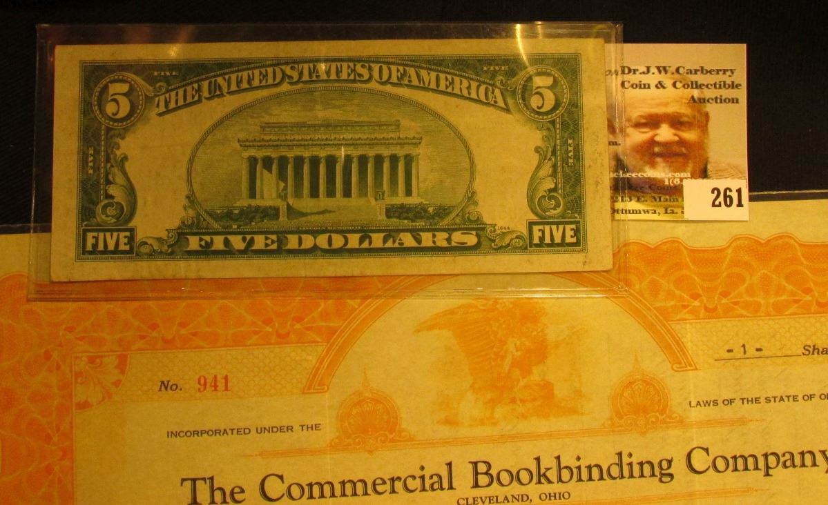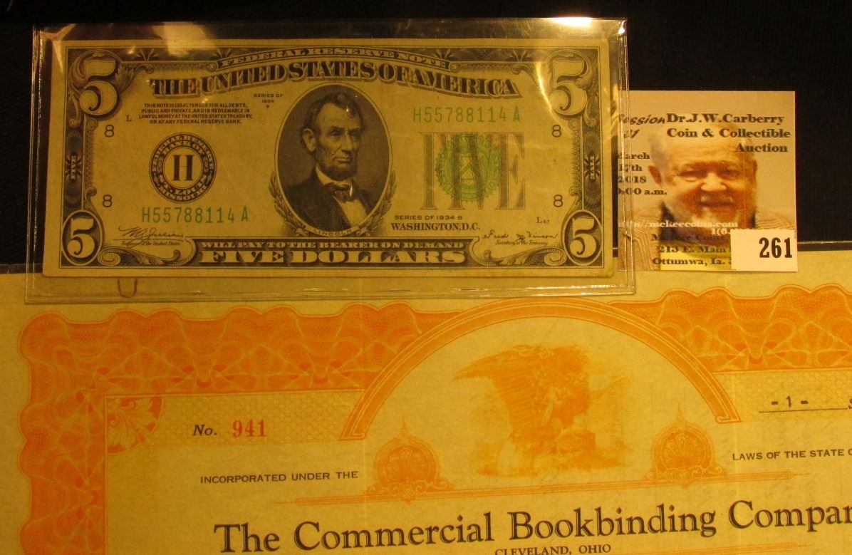 Oct. 14, 1930 One Share Stock "The Commercial Bookbinding Company Cleveland, Ohio", hole cancelled; & Series 1934B $5 F.R.N. from St. Louis, Mo., obverse plate no. L87, rev. plate # 1644, EF-AU.