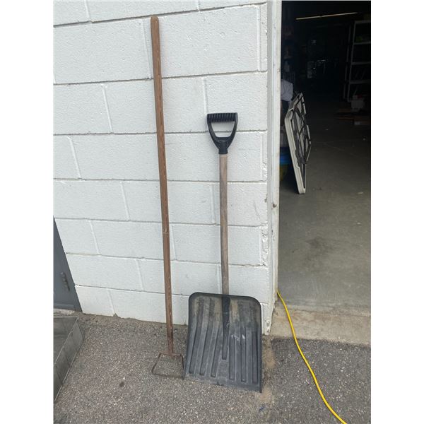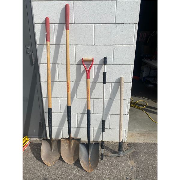 Shovels, pick axe and extension pole