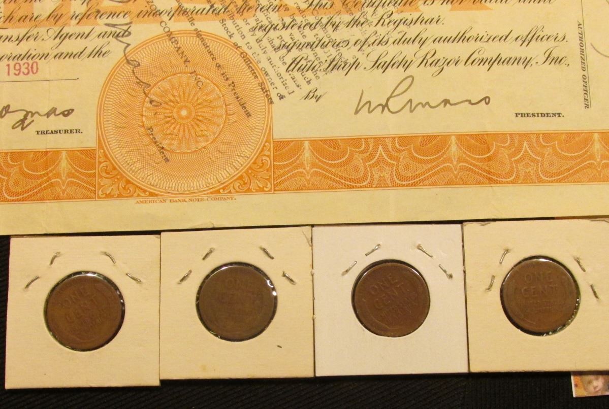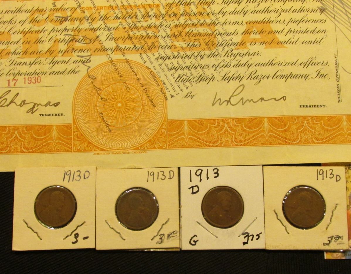 Oct. 17, 1930 Convertible Class A Stock Certificate for "Auto Strop Safety Razor Company, Inc.", scantily clad Roman male figure in central vignette facing right; & (4) 1913 D Cents all Good to VG.
