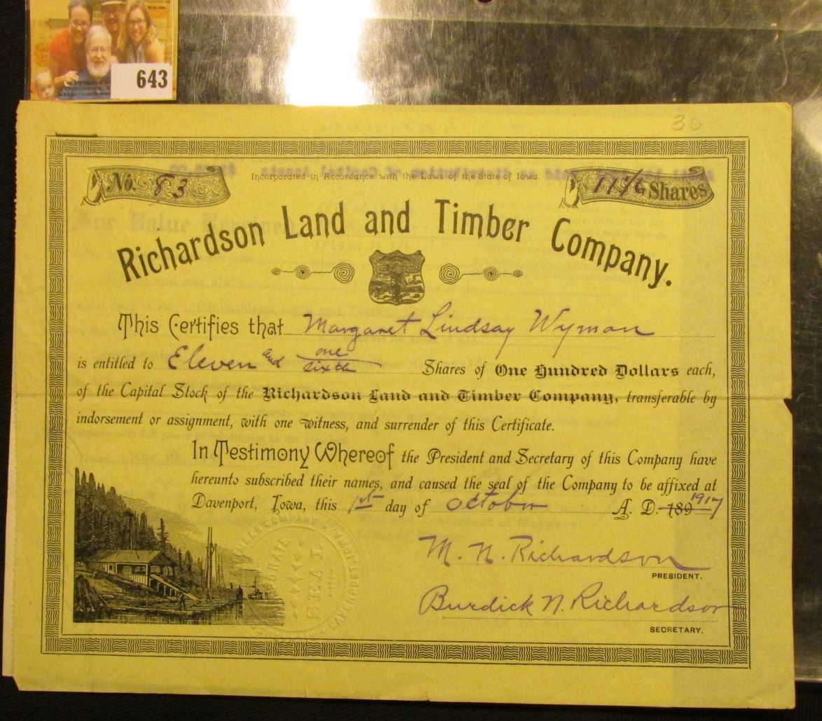 Oct. 1st, 1917 Stock Certiticate No. 83 for 1146 Shares at $100 per Share of "Richardson Land and Timber Company, lower central Notary Seal "Davenport, Iowa", vignette of loggers on shore of Mississippi River.