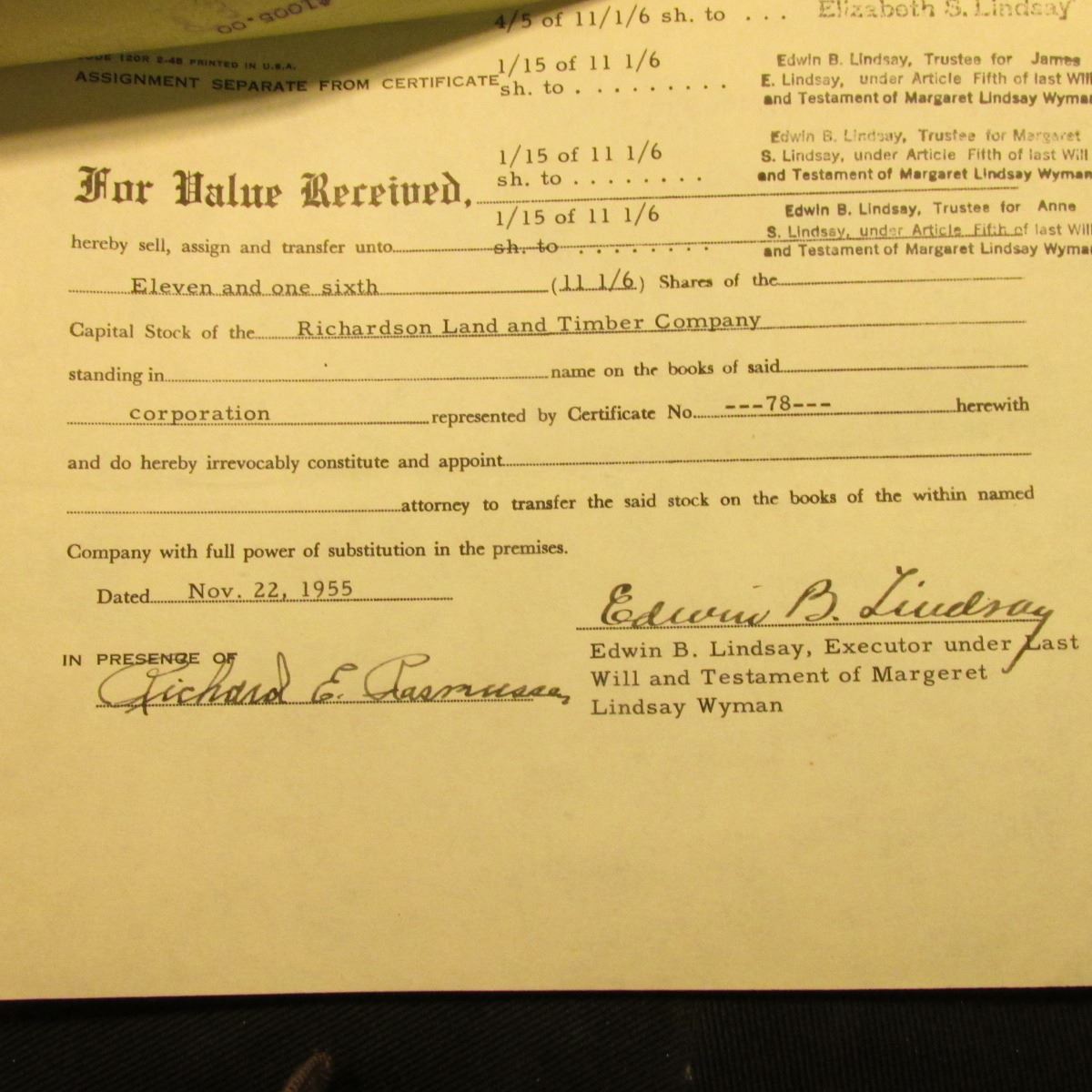 Oct. 1st, 1917 Stock Certiticate No. 83 for 1146 Shares at $100 per Share of "Richardson Land and Ti