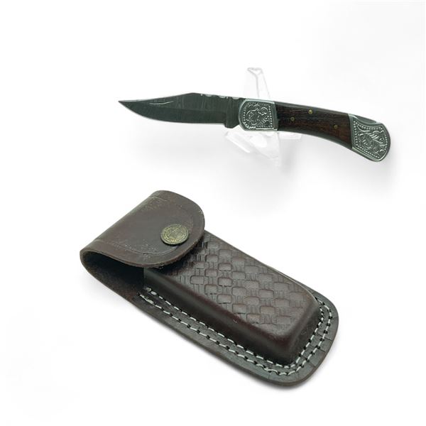 Folding 5.25" Damascus Blade Knife with Leather Sheath44 - Folding 5.25" Damascus Blade Knife with Leather Sheath