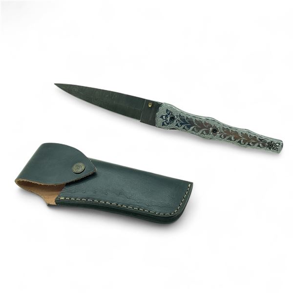 Folding 5.25" Damascus Blade Knife with Leather Sheath