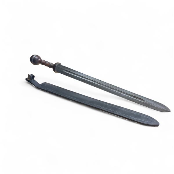25.5" Damascus Blade Sword with Leather Sheath and Wood Hilt