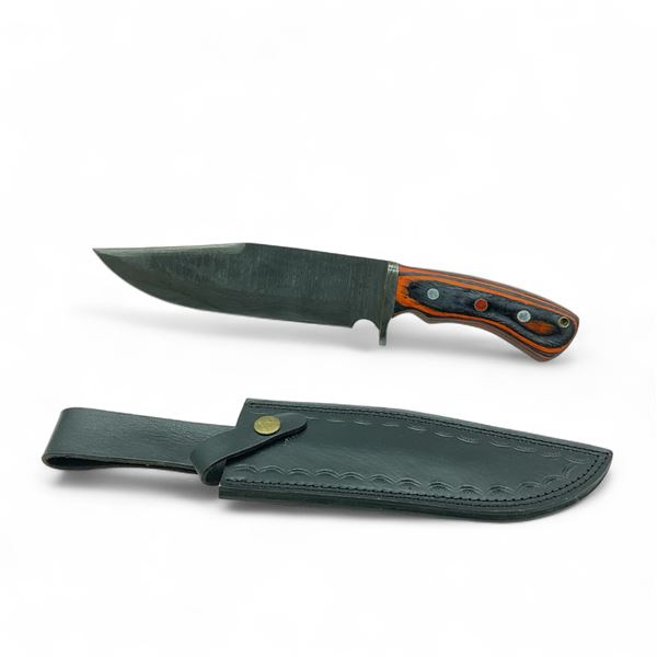 Fixed 6 1/2" Damascus Blade Orange Wood Handled Knife with Belt Sheath