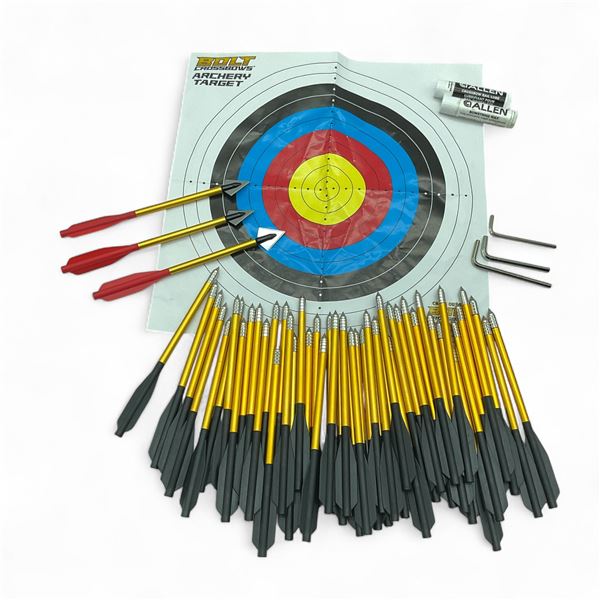 Assorted Crossbow Bolt (6-1/4") x 52 Qty, Rail Lube, Bow String Wax, Crossbow Target and Assorted Allen Keys