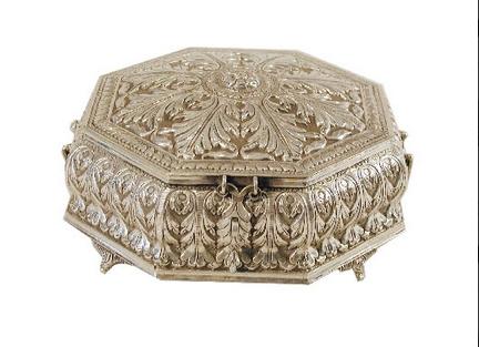 Octagon Jewelry Box - Hand Made Heavily Decorated Sterling Silver Jewelry Box/ Utility Box - 29 Oz (900 Grams) Approximate "Timeless Treasure" by Shakuntalam Silvercraft.
