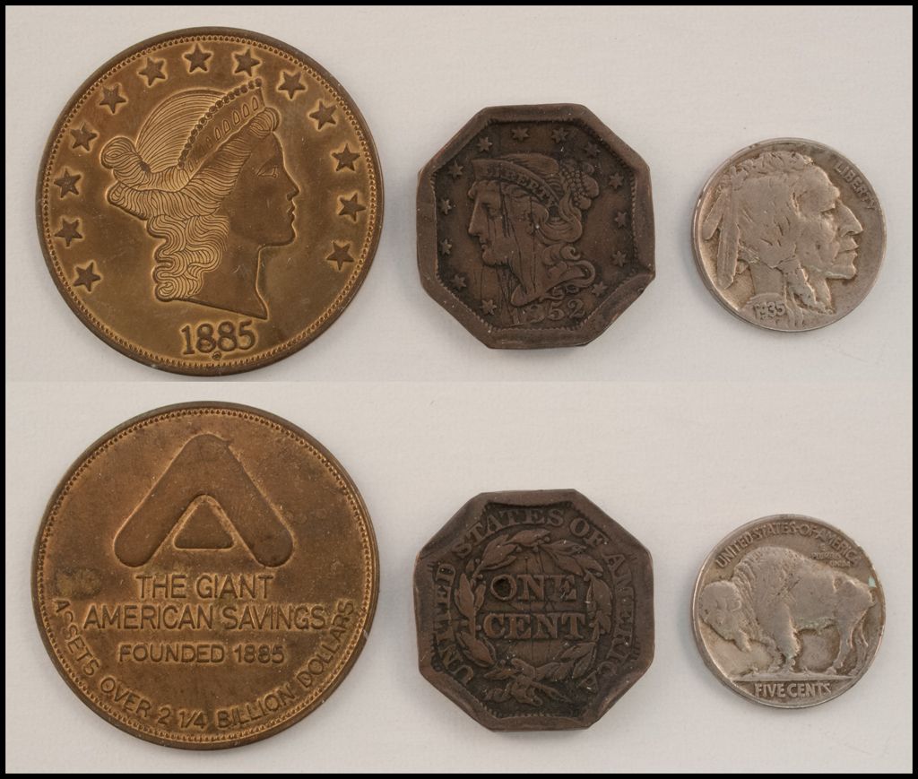 1852 One Cent *rare // Buffalo Nickel 1935 // $50 gold piece facsimile (The Giant American Savings)