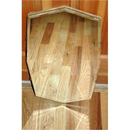 Lovely old octagonal beveled glass mirror. It is mounted on a board and is ready to hang from the chain on the back. It is: 21 1/2" x 12 5/8". The condition is good. There is bit on silver back worn off the very edges. The plywood back has some pealing. The glass is thick and quite heavy. <p> The reflection that you are seeing is my hardwood floor. The line that runs across the mirror is from the flash bouncing off the beveled edges of the mirror.