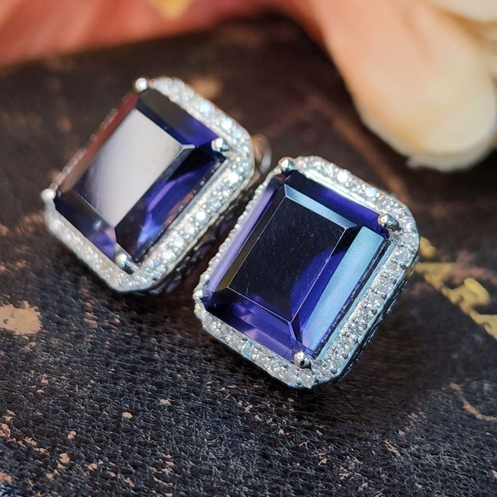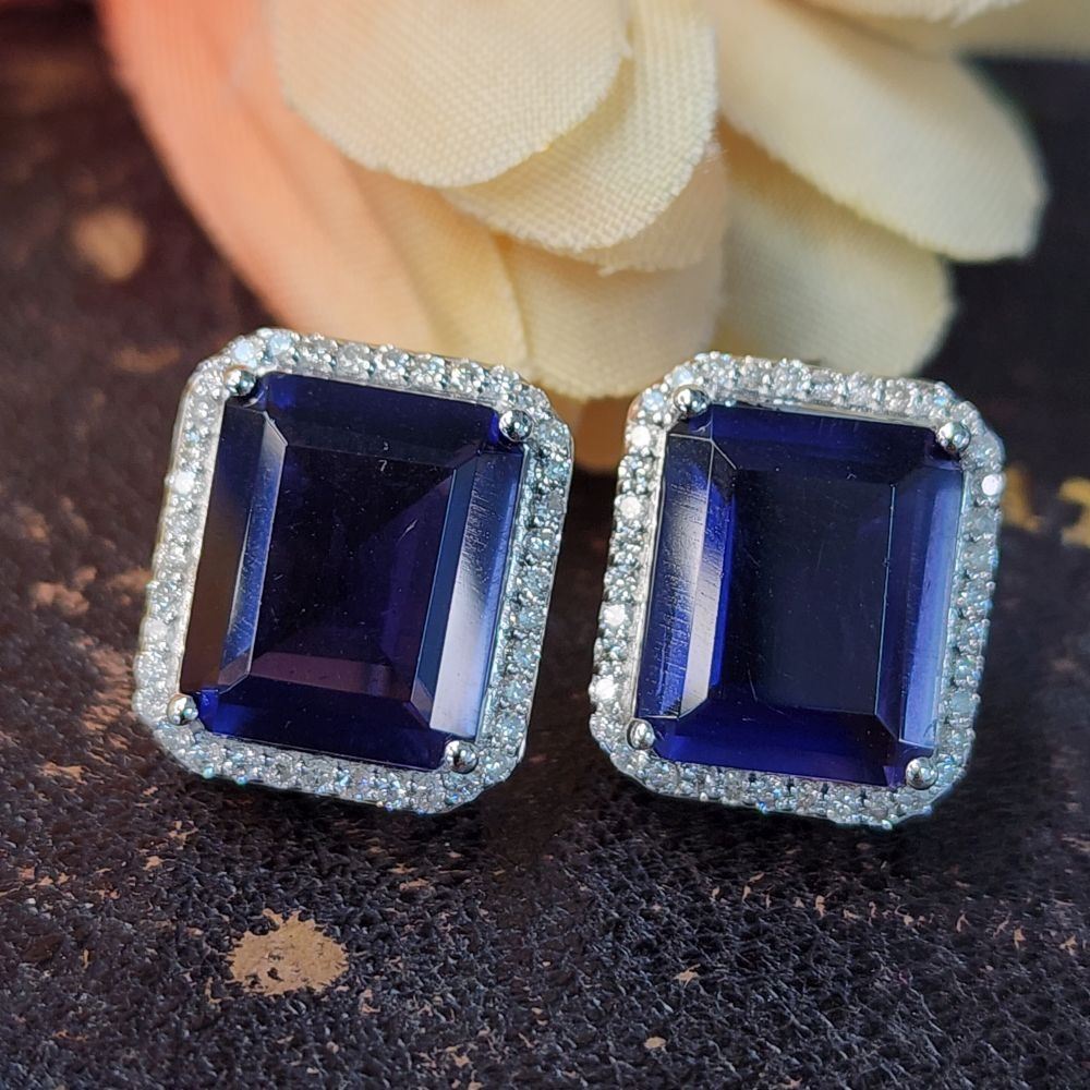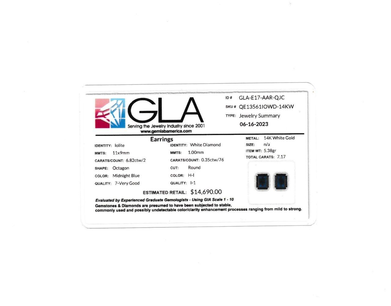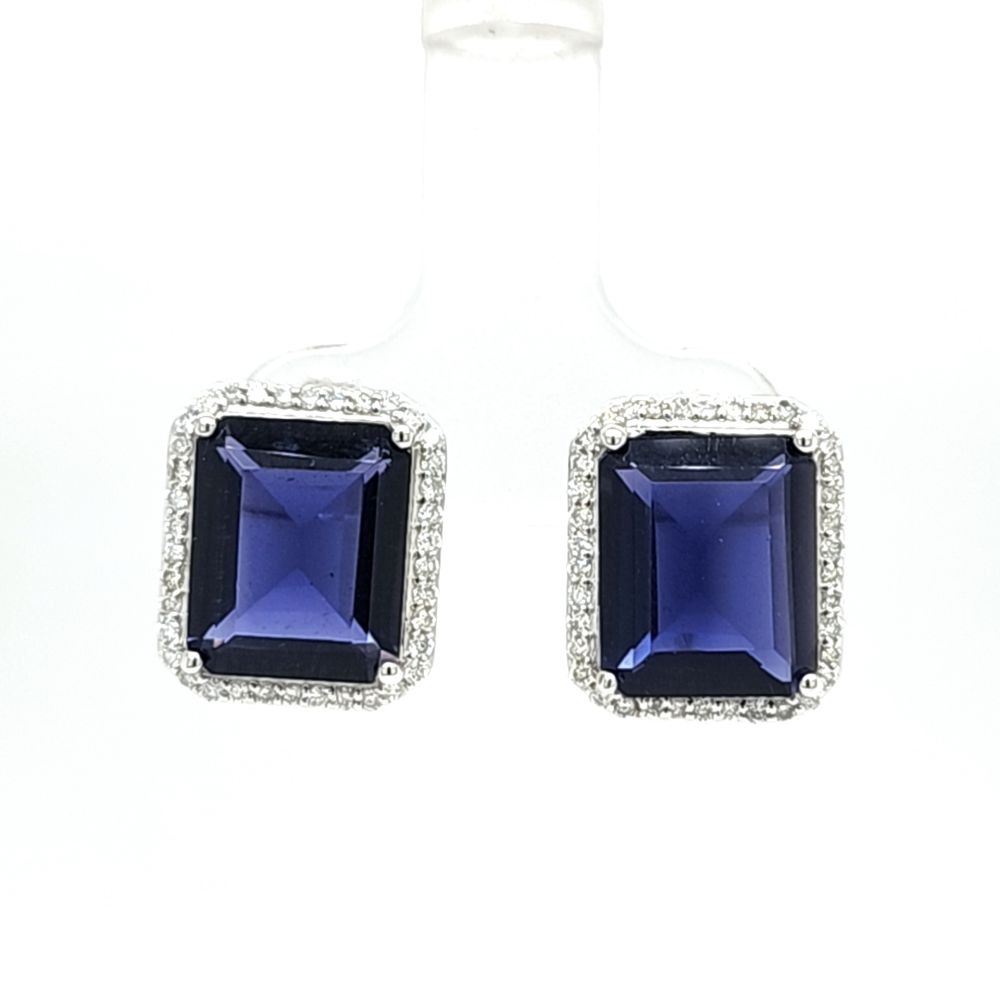 Genuine Iolite and Earth-Mined Diamond Earrings.& nbsp; These 14 karat white gold earrings feature 6.82 carats of octagonal-cut iolites that are prong-set with .35 carats of round, brilliant-cut, H-I color, I1 clarity diamonds in the halos.& nbsp; The earrings have swirled side galleries and attach to the earlobe with posts and friction backs.& nbsp; This pair of earrings is certified and appraised for $14,690.00 estimated retail replacement value.& nbsp; Check out the ring in Lot 175 to make a nice looking set!