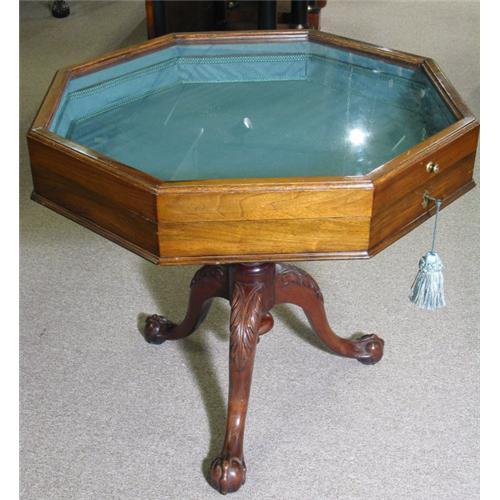 Chippendale style English walnut octagonal display table. Ball and claw feet with acanthus leaf knees. Lockable . c.1850 Lining in perfect condition.