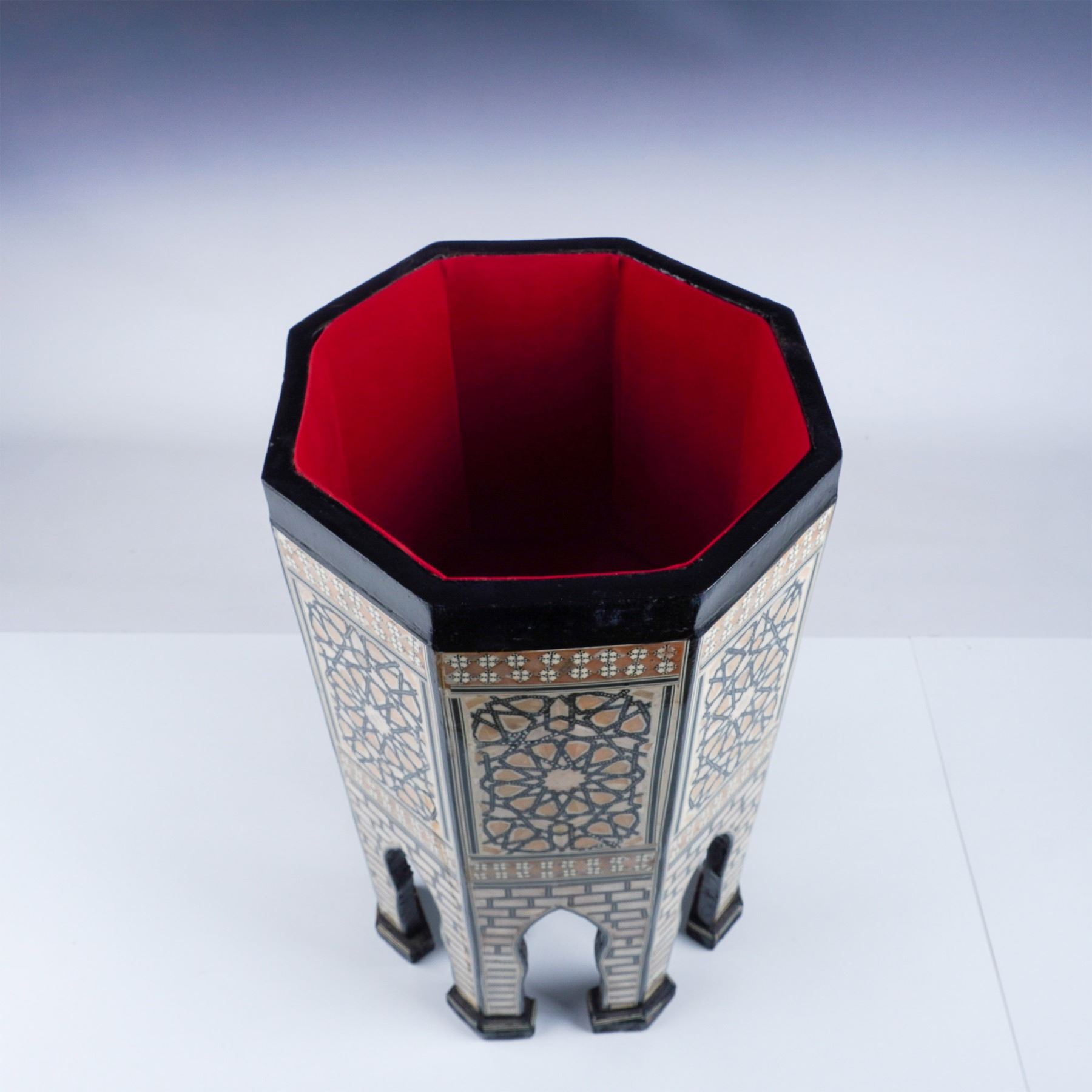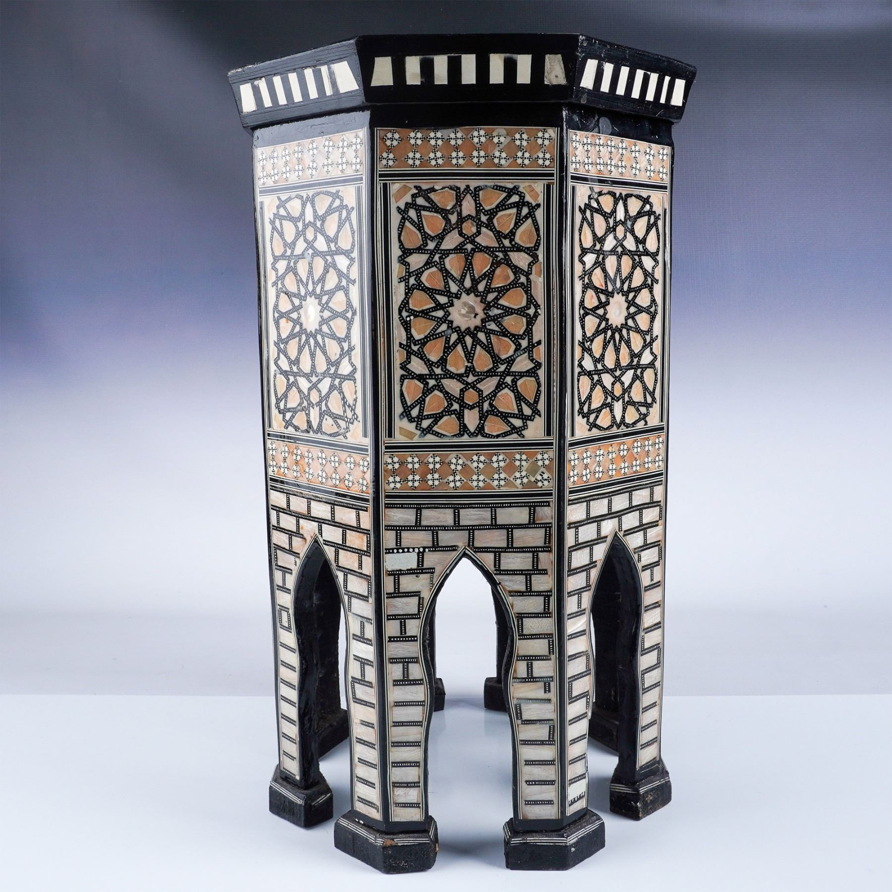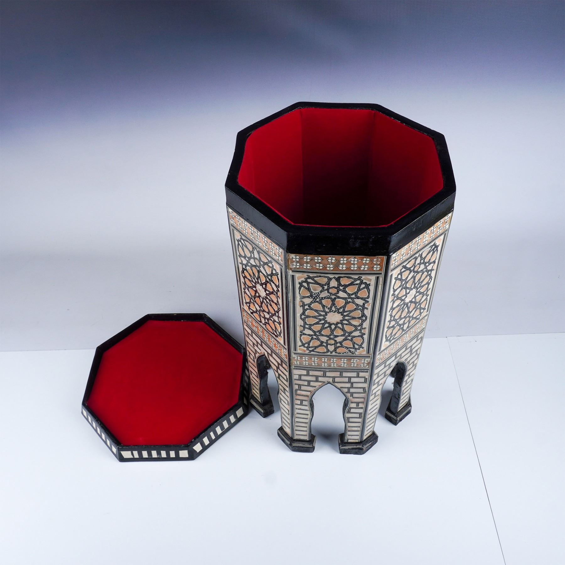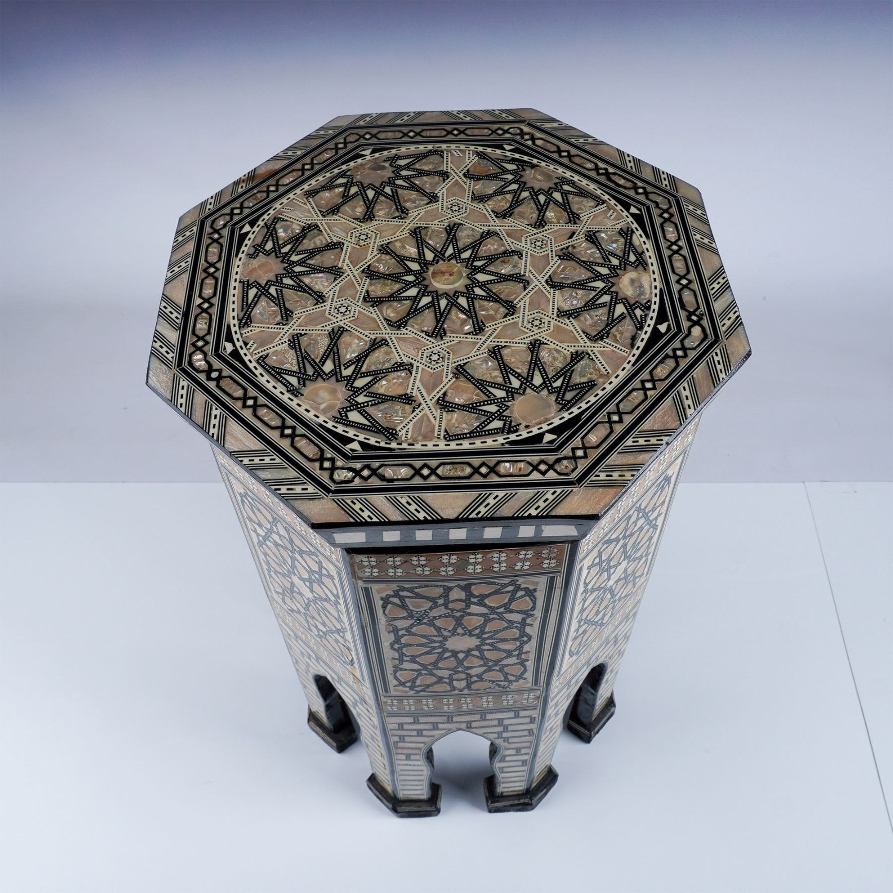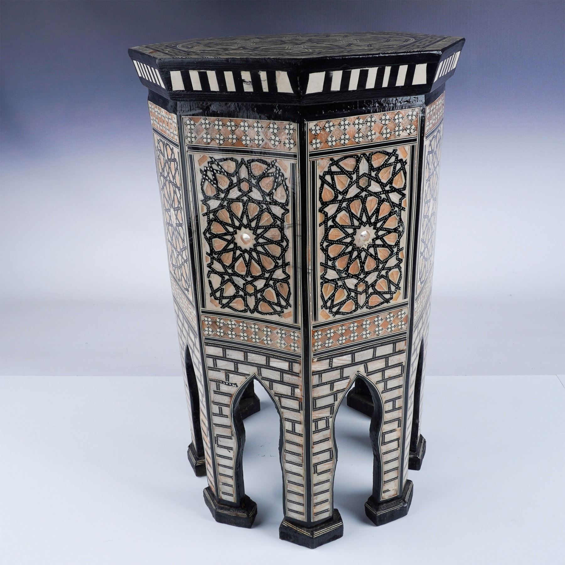 A handcrafted octagonal wooden table standing 19.5 inches in height, featuring intricate inlay work in a Moroccan design. The table showcases geometric patterns and Moorish-style arches, accented with vibrant details and a classic color palette of black, gold, and beige. The detachable top is lined with a rich red interior, offering functionality alongside its decorative appeal. This piece embodies traditional artistry and cultural elegance, ideal for use as an accent table or a display item.