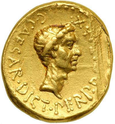 Octavian and Julius Caesar. Gold Aureus (6.84 g) minted in Italy, 43 BC. Bare head right of Octavian. Reverse: Laureate head right of Caesar. Cr. 490/2; CRI 132. Striking irregularity. Very Rare. Very Fine with an excellent portrait of Julius Caesar.