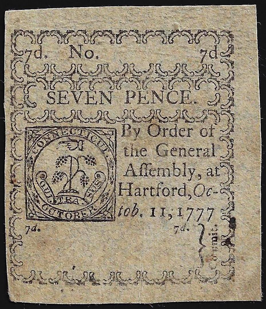 One October 11, 1777 Seven Pence Connecticut Colonial Currency Note.