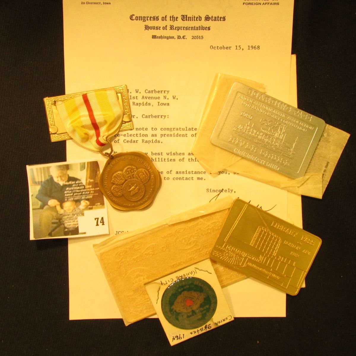 October 15, 1968 Letter from Congressman John Culver to Dr. J.W. Carberry congratulating him on becoming president of the Cedar Rapids Coin Club (Iowa); 1964 Central States Numismatic Association Kansas City (Missouri) Token, 39mm; 1979, 1980, & 1982 American Numismatic Association Metal Passes; & 1967 American Numismatic Association Dealer Badge.