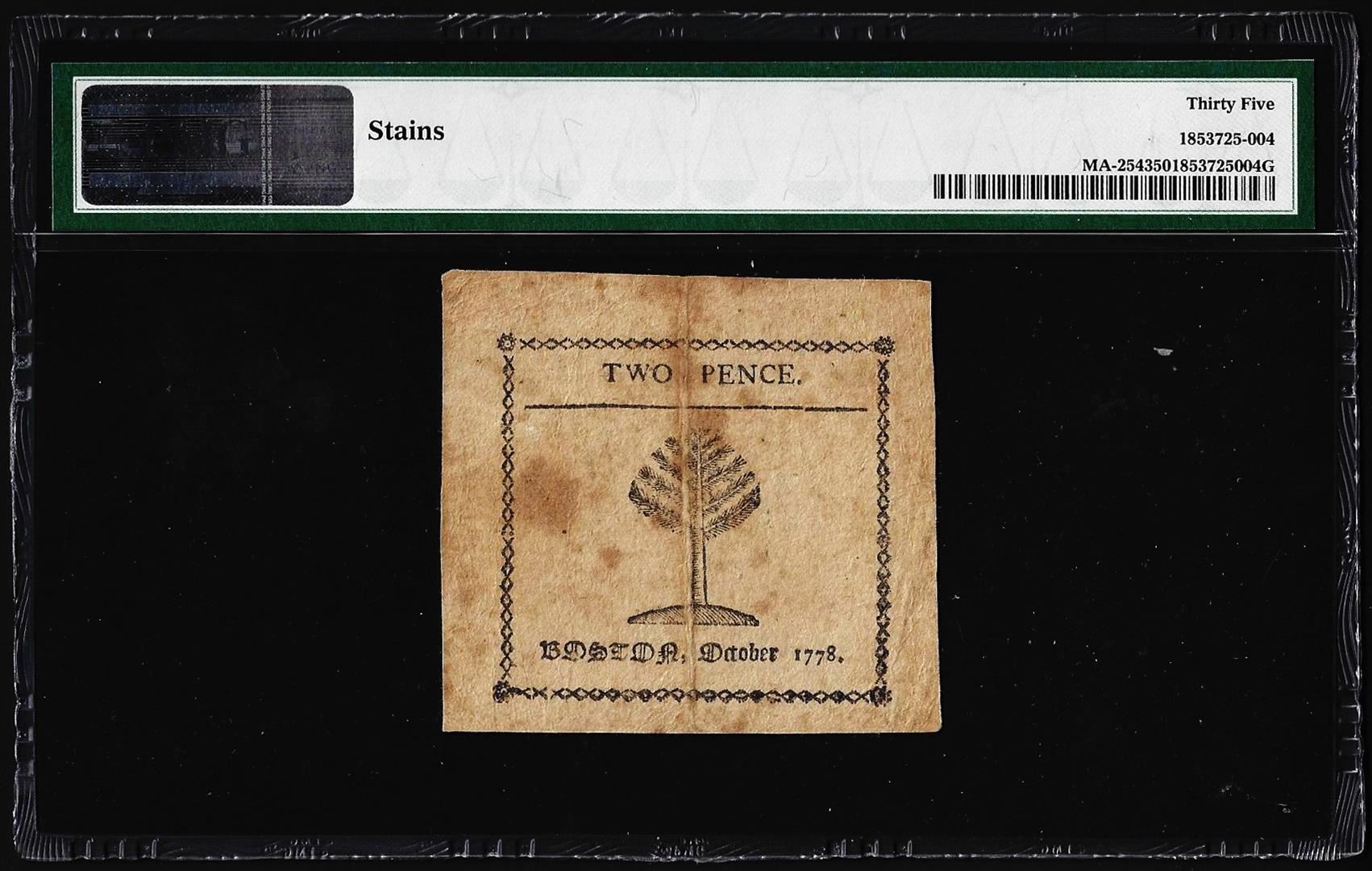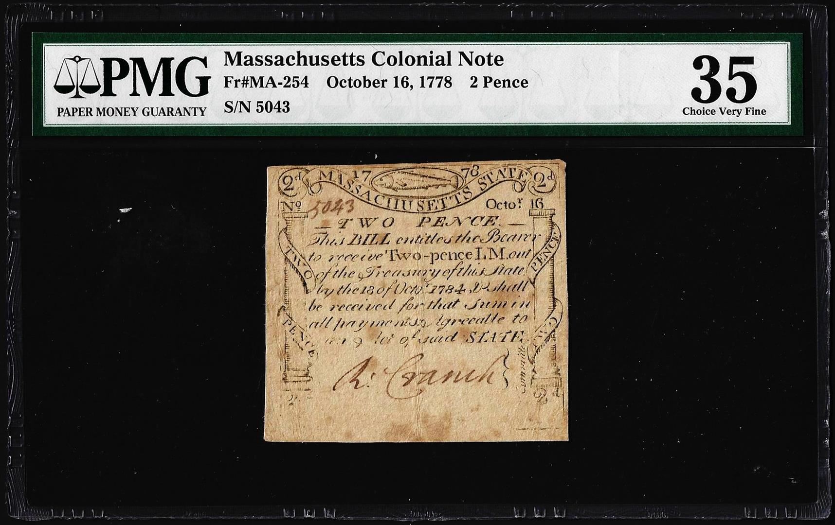 October 16, 1778 Massachusetts 2 Pence Colonial Currency Note PMG Choice Very Fi