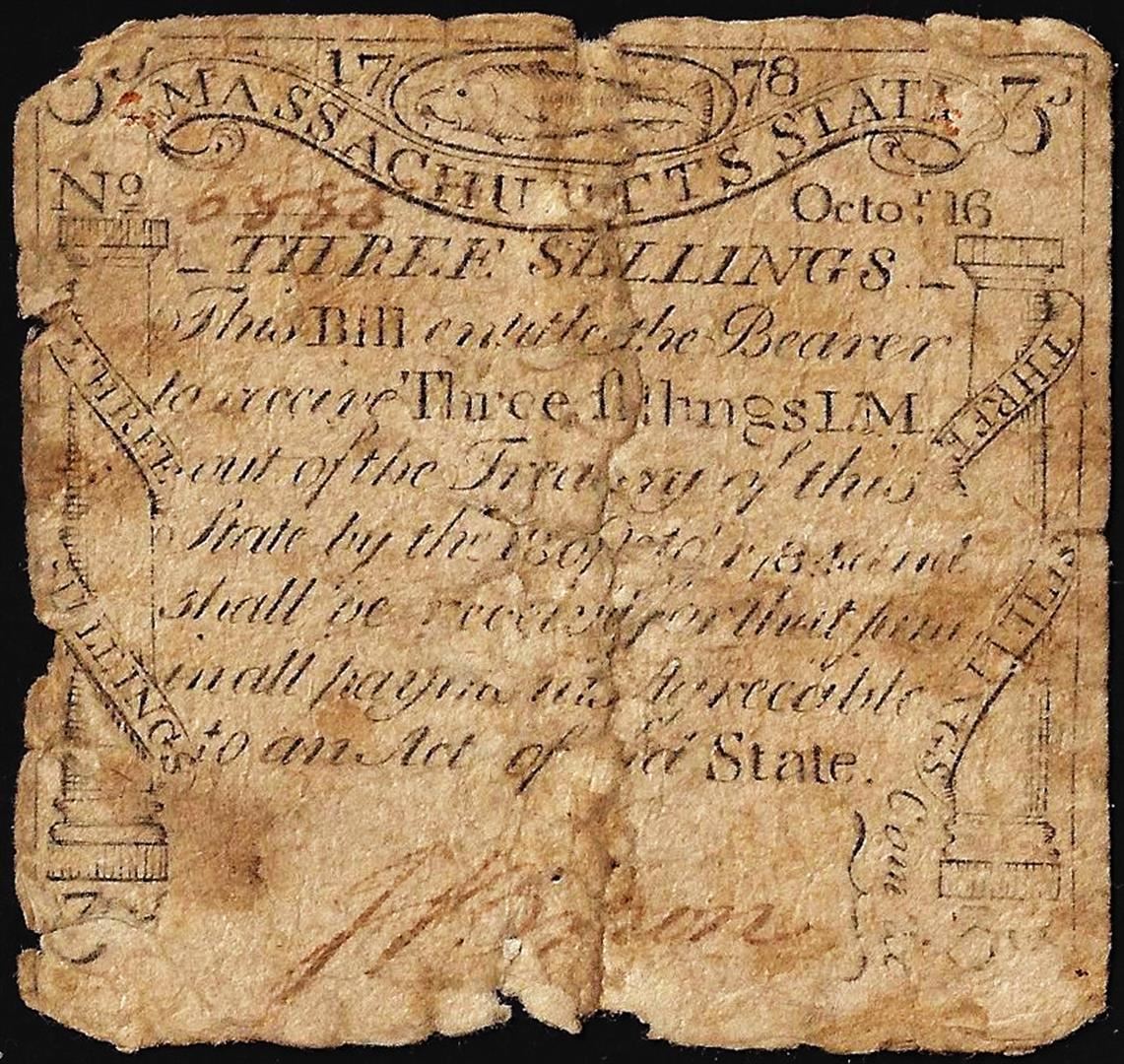 October 16, 1778 Three Shillings Massachusetts Colonial Currency Note