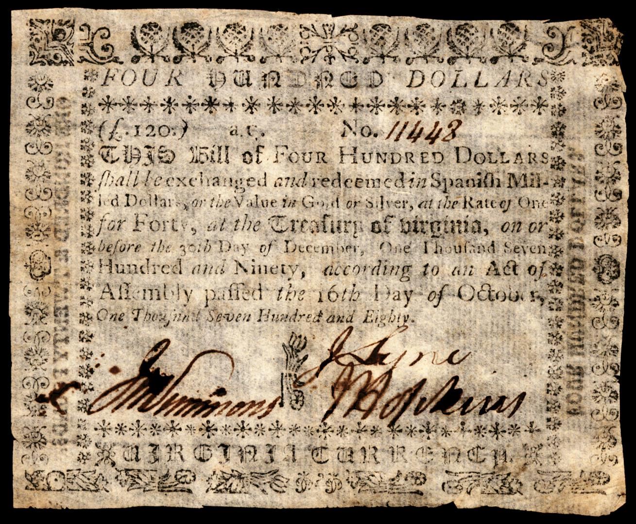 One October 16, 1780 Virginia $400 Colonial Currency Note.