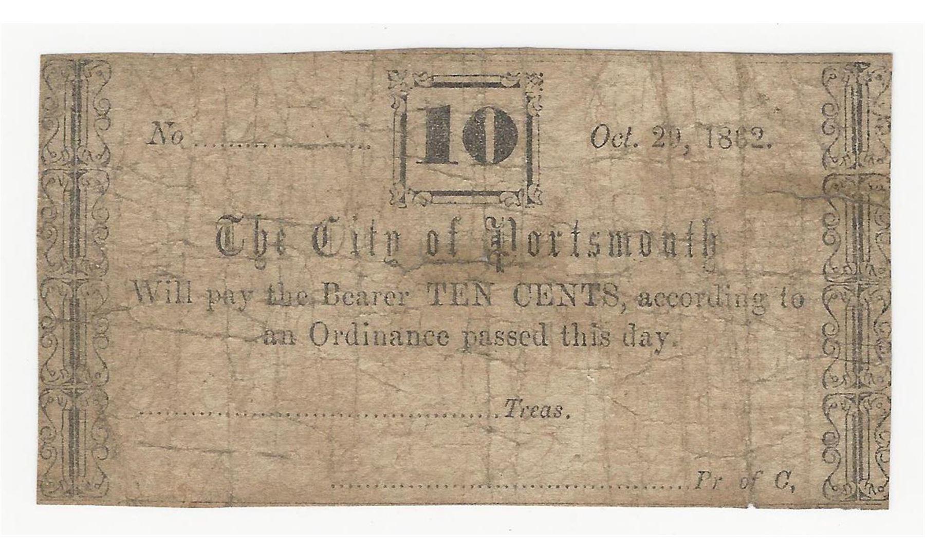 One October 20, 1862 10 Cents The City of Portsmonth Obsolete Note.