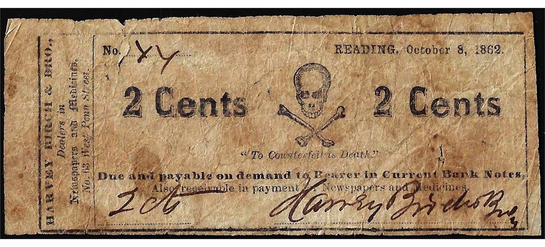 One October 8, 1862 Two Cents Harvey Birch & Bro Reading, PA Obsolete Note.