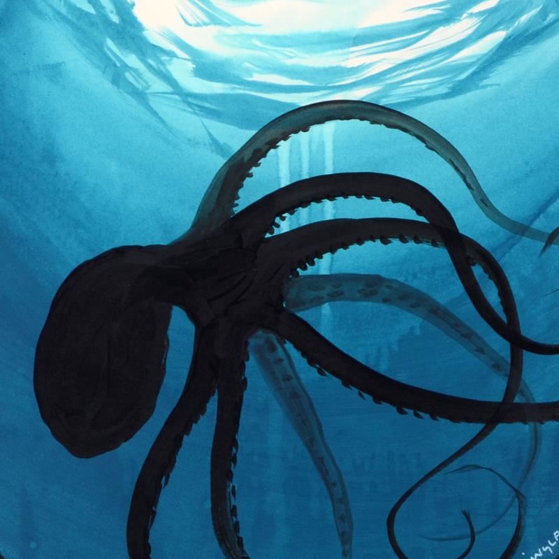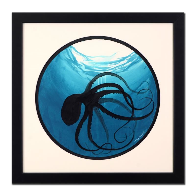 "Octopus" is an original watercolor painting on round cut deckle edge paper by Wyland, hand signed by the artist. This piece is custom framed. Includes Certificate of Authenticity. Measures approx. 28.5" x 28.5" (frame), 19" (image diameter).