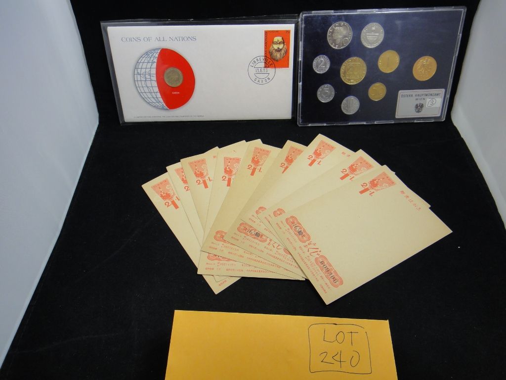 Includes vintage unused Asian postcards as well as a two world coin sets.