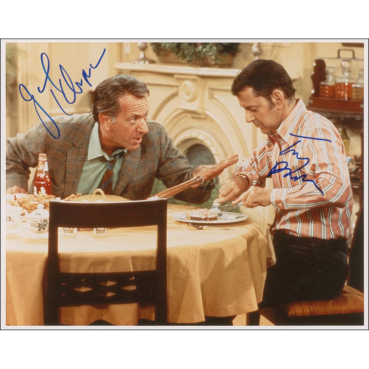 Color glossy 10 x 8 photo from the television program showing Oscar and Felix at the dinner table, signed in blue felt tip by Tony Randall and Jack Klugman. In fine condition, with a trivial fingerprint mark.