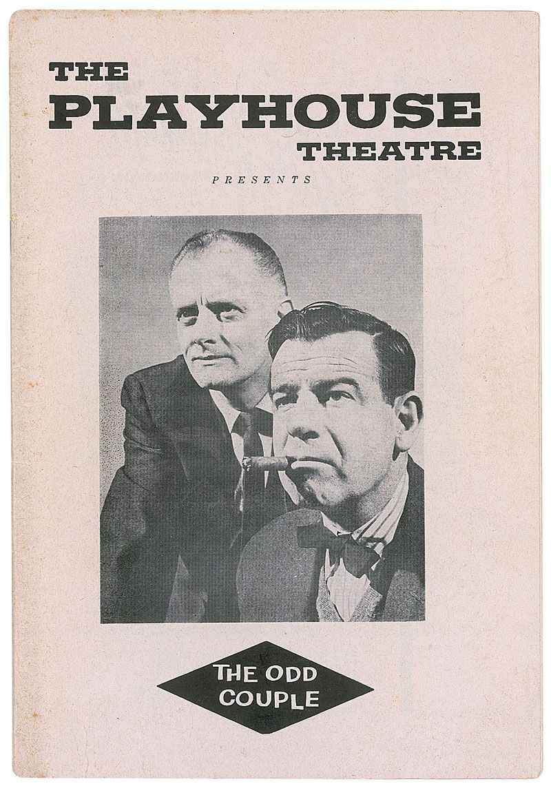 Playbill for the Playhouse Theatre production of The Odd Couple in January 1965, 6.5 x 9.25, 31 pages, signed inside on the cast listing page in blue ballpoint by Neil Simon, Art Carney, Walter Matthau, Carole Shelley, Monica Evans, Nathaniel Frey, John Fiedler, Paul Dooley, and Sidney Armus. Light scattered foxing throughout, otherwise fine condition.